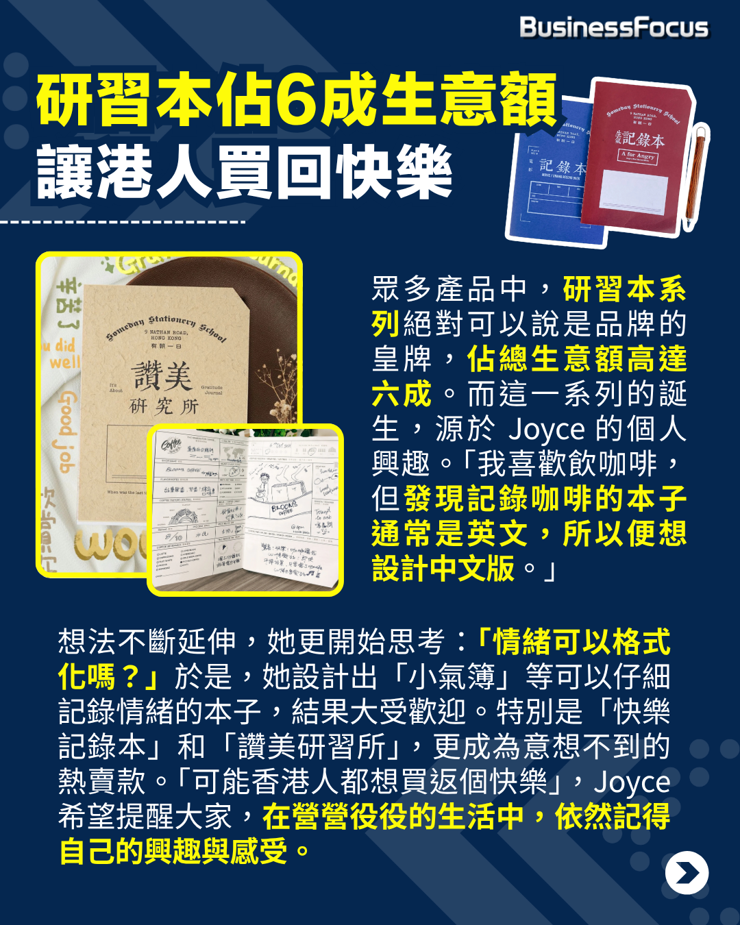 這個想法不斷延伸,她更開始思考:「情緒可以格式化嗎?」於是,她設計出「小氣簿」等可以仔細記錄情緒的本子,結果大受歡迎。特別是「快樂記錄本」和「讚美研習所」,更成為意想不到的熱賣款。「可能香港人都想買返個快樂」,Joyce 正是如此解讀,希望提醒大家在營營役役的生活中,依然記得自己的興趣與感受。