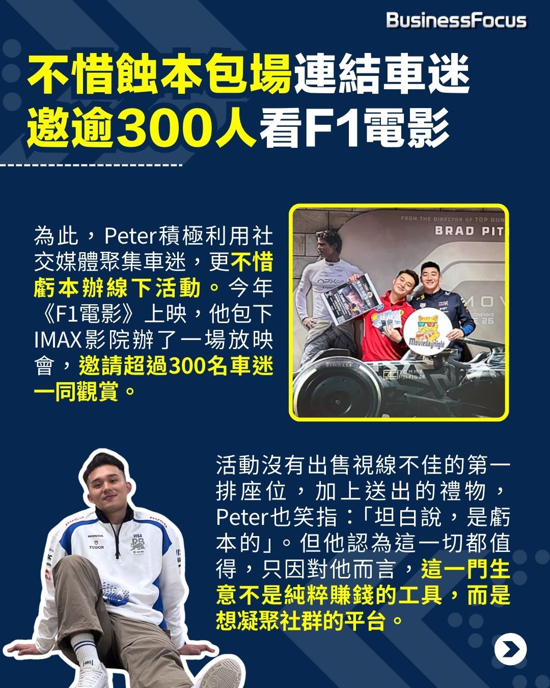為此,PACIERS的定位不僅是零售店,更是一個交流平台。Peter積極利用社交媒體聚集車迷,更不惜虧本辦線下活動。今年《F1電影》上映,他為此辦了一場放映會,包下IMAX影院,並邀請超過300名車迷一同觀賞。是次活動沒有出售視線不佳的第一排座位,加上送出的禮物,Peter也笑指:「坦白說,是虧本的」。但他認為這一切都值得,只因對他而言,這一門生意不是純粹賺錢的工具,而是想凝聚社群的平台。