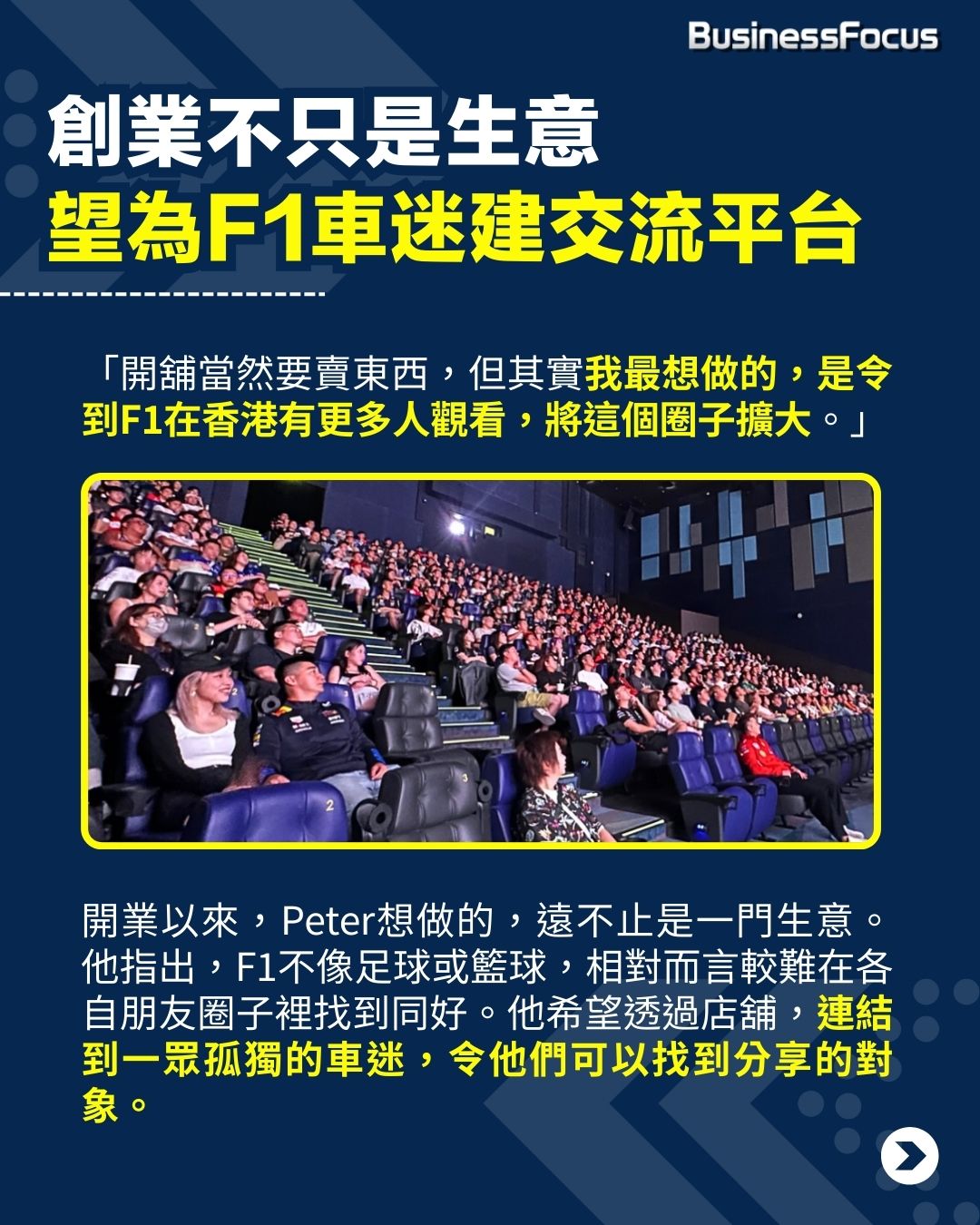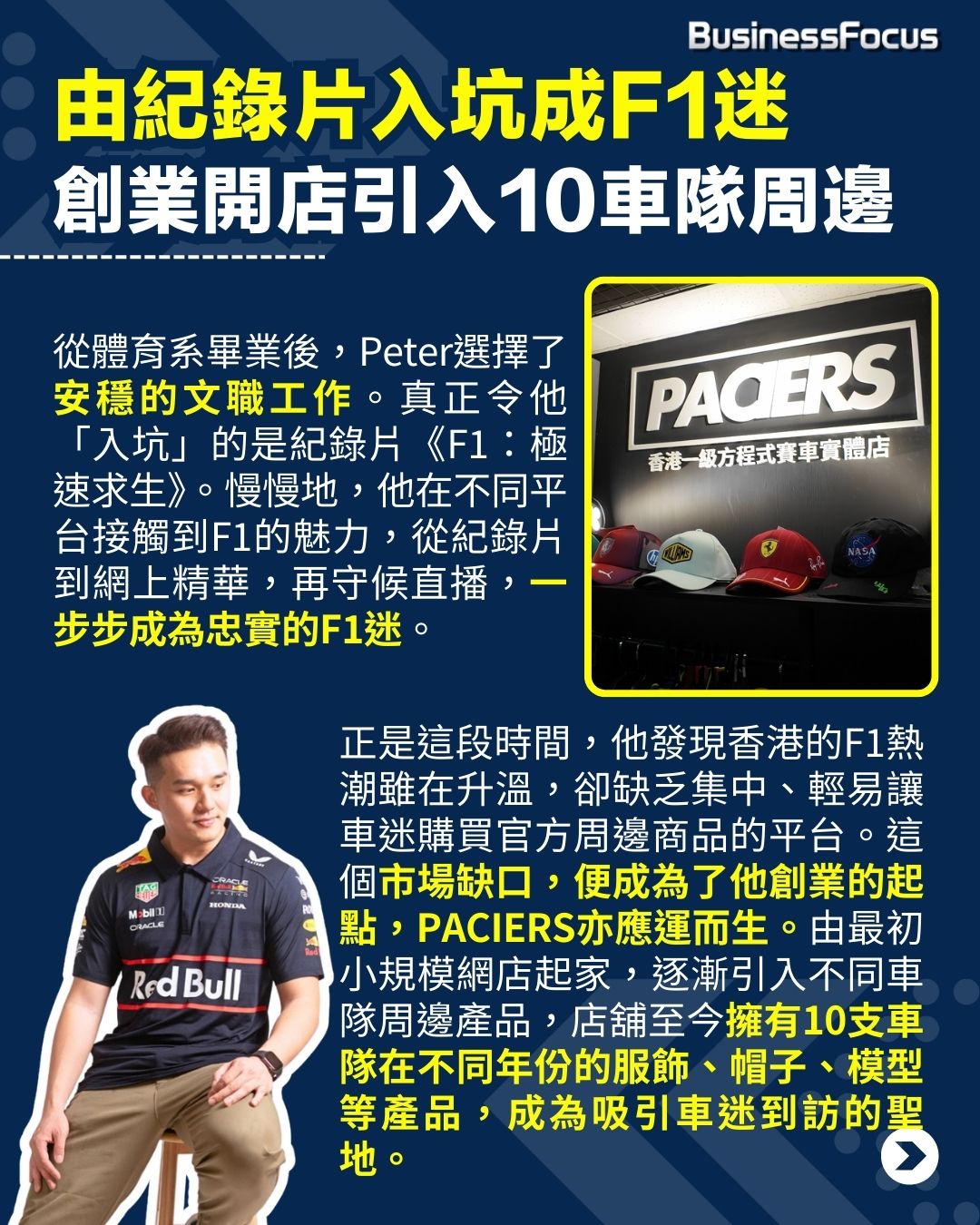 F1(一級方程式賽車)熱潮席捲全球,一項被視為「燒錢玩意」的極限運動,同時因刺激的比賽節奏,吸引不少車迷。PACIERS店主、90後Peter 正是其中一員,數年前就因為紀錄片熱愛上F1。但他不止於觀賽,更毅然放棄穩定工作,將興趣化為事業,開店售賣F1賽車周邊商品,高峰時期月達500訂單。生意之外,他更希望店舖可以成為凝聚F1愛好者的平台,近期更不惜蝕本包場,邀請逾300車迷到影院觀看《F1電影》。
