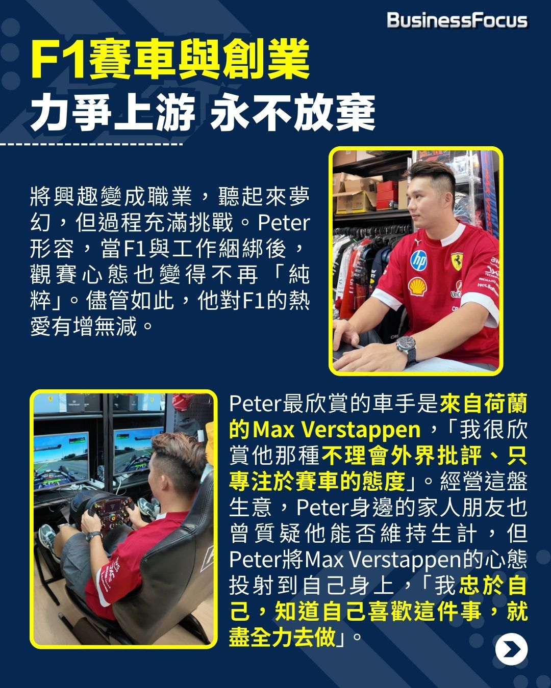 Peter指,自己最欣賞的車手是Max Verstappen,也從其身上找到不少啟發。「我很欣賞他那種不理會外界批評、只專注於賽車的態度」,他說。經營這盤生意,Peter身邊的家人朋友也曾質疑他能否維持生計,但Peter將Max Verstappen的心態投射到自己身上,「我忠於自己,知道自己喜歡這件事,就盡全力去做」。