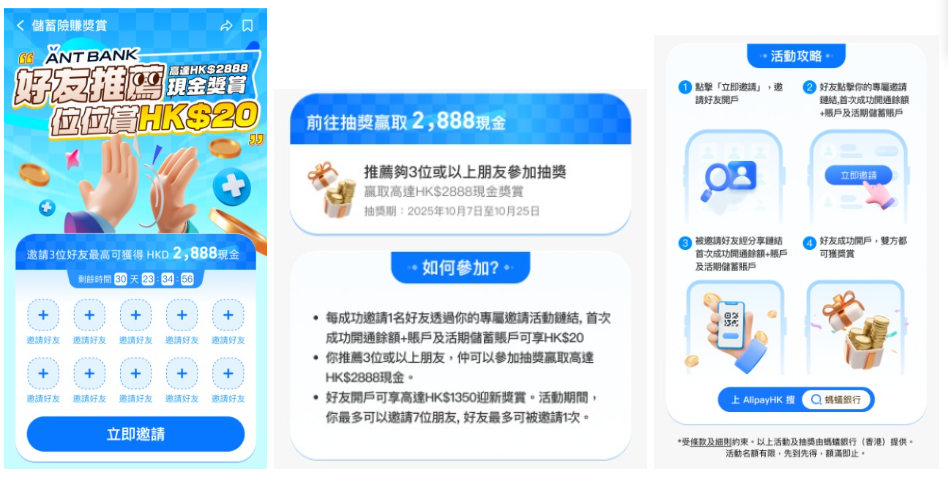 - 推薦大抽獎:成功邀請3位或以上的好友,即可參加 HK$2,888 現金大抽獎 。