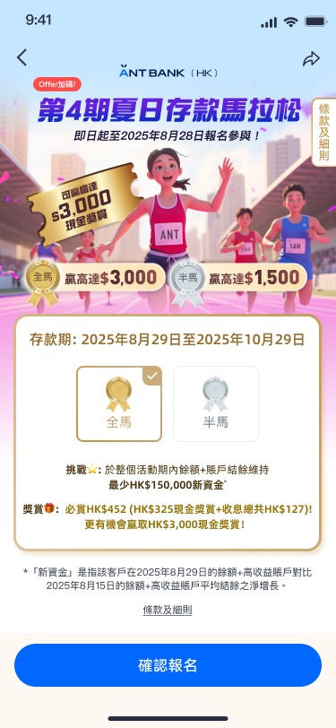 除了抽獎,亦有人人有賞的「第4期夏日存款馬拉松」,用戶可於2025年8月12日至2025年8月28日報名,並在2025年8月29日至2025年10月29日的存款期內完成挑戰 :