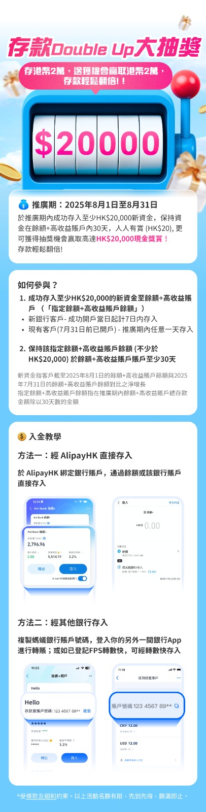 成功開戶後,存入資金即可參與抽獎,在2025年8月1日至2025年8月31日的活動期內,用戶只需於「餘額+」高收益賬戶存入最至少HK$20,000新資金*,並將新資金*保持在「餘額+」高收益賬戶30天,即可自動參與「存款DoubleUp大抽獎」,有機會贏取高達HK20,000 現金獎賞。