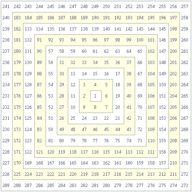 四方圖體現了「圓方練習」(squaring the circle),即畢達哥拉斯立方。Gann 引用法拉第名言:「自然界中只有數學,數學是一切的基礎。」他使用圓、正方和三角形,在 360 度循環中尋找時間、價格和空間的阻力點。四方圖的螺旋結構從中心「1」開始,順時針展開,數字「2」在其左,猶如金字塔塔尖,象徵宇宙起點。每個從中心延伸的主要角度線可用一元二次方程式表達。例如,奇數平方數列(9, 25, 49, 81, 121, 169, 225)及偶數平方數列(4, 16, 36, 64, 100, 144)可用公式 (2n+1)² = 4n² + 4n + 1 表達。在時間價格圖表中,這些數列形成拋物線曲線族,當四方圖上的數字序列呈特定角度時,價格可能處於拋物線臨界點或軌道變化,出現拐點,與價格走勢形成對應。