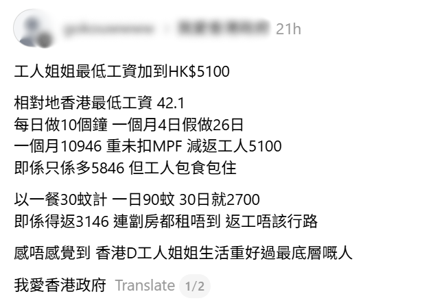 針對外傭最低工資調整一事,即引起許多網民的關注。有網民在社交平台 Threads 發帖,提到外傭最低工資調升至每月5,100港元。他以本地最低工資時薪42.1元作比較,假設本地工人每日工作10小時、每月休4天,即月工作26日,月薪僅約10,946港元,扣除強積金後實際所得更少。他直言,對比之下外傭雖然只領取5,100元薪金,但僱主需提供免費食宿,「等於香港基層工人仲辛苦,生活仲未必及得上工人姐姐」。
