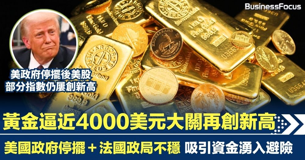 黃金再創歷史高點!逼近4000美元大關 美國政府停擺+法國政局不穩 吸引資金湧入避險