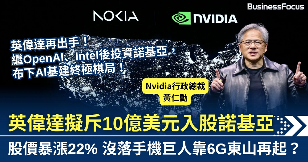 據報道,美國晶片巨頭英偉達(Nvidia,美股NVDA)將買入芬蘭電訊設備商諾基亞(Nokia,美股:NOK)10億美元股份,並以發行新股支付,獲得諾基亞2.9%股權,成為其重要股東。此舉帶動諾基亞股價暴升逾2成,市場關注這家昔日手機巨頭能否藉此東山再起。雙方亦達成戰略合作,將共同研發6G技術,並推動把諾基亞的5G及6G軟件技術加入英偉達晶片,拓展人工智能網絡領域發展。