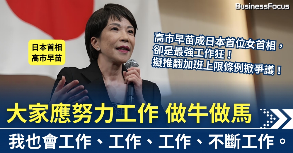 以自民黨右翼鐵娘子聞名的高市早苗,於10月4日的自民黨總裁選舉中擊敗小泉進次郎等對手,成為該黨首位女性總裁,並於21日正式成為日本首位女首相。她在勝選後卻語驚人,呼籲大家拋開所謂「工作與生活的平衡」,又認為人應該「不斷工作、工作、工作、工作,再工作」。現年64歲的高市早苗以「要大家都一起來幹活」的強硬工作態度引人注目,甚至要求黨員「像牛馬一樣幹活」。近日,日本首相高市早苗有意推翻五年前出台的加班工時上限條例,讓日本回到工作狂時代,引發更大的爭議,網民憂日本再變職場地獄。