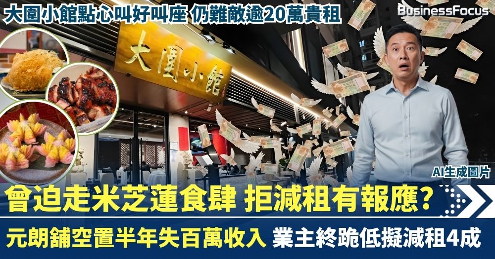 業主拒絕減租助食肆渡難關,終自食其果損失慘重!曾榮獲《米芝蓮指南》推介的「大圍小館」元朗分店雖頗受歡迎,惟市民北上成風,食肆無力承擔天價租金,業主又拒絕減租,今年5月黯然結業。但該巨舖其後空置半年仍租不出,業主料損失逾百萬元租金收入。據報道,業主至近日終接受現實,正考慮把月租下調4成至近20萬元,以求找到租客。有網民認為這是業主的報應,有人更促政府設立舖租升幅的管制,保障小店生存空間。