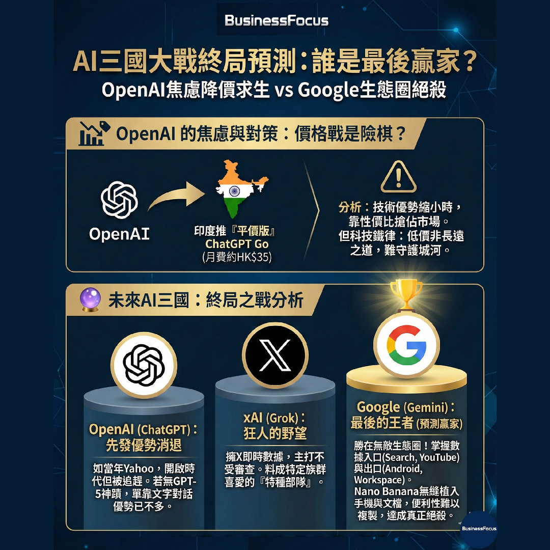展望未來,由ChatGPT、Gemini及Grok引發的 AI 三國大戰的終局會如何?有專家有如下分析:
