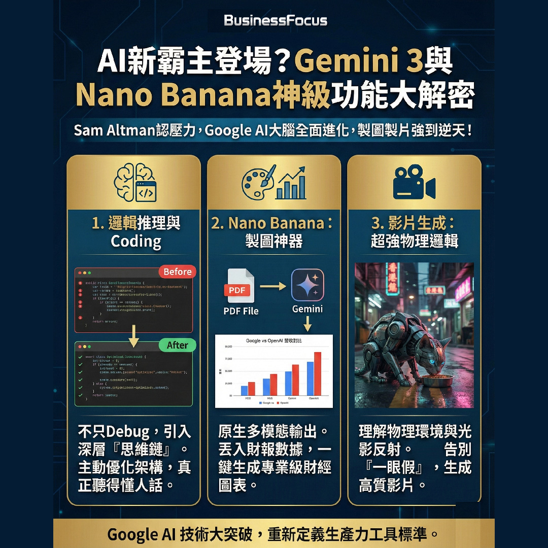 AI界的「權力遊戲」正式進入白熱化階段!如果你還以為ChatGPT是唯一的 AI霸主,這觀念可能要改了。大約一星期前,Google母公司Alphabet(美股:GOOGL)投下了震撼彈:Gemini 3 正式登場,加上之前已引起全球熱議的強大製片模型「Nano Banana」,引起全球網民關注。連ChatGPT母公司OpenAI行政總裁Sam Altman都感到壓力,他在近日向員工發出的內部信件中罕有承認,OpenAI的AI技術領先優勢正在縮小,Google在AI預訓練 (Pre-training) 上已經取得突破性進展,甚至可能在某方面超越了ChatGPT!