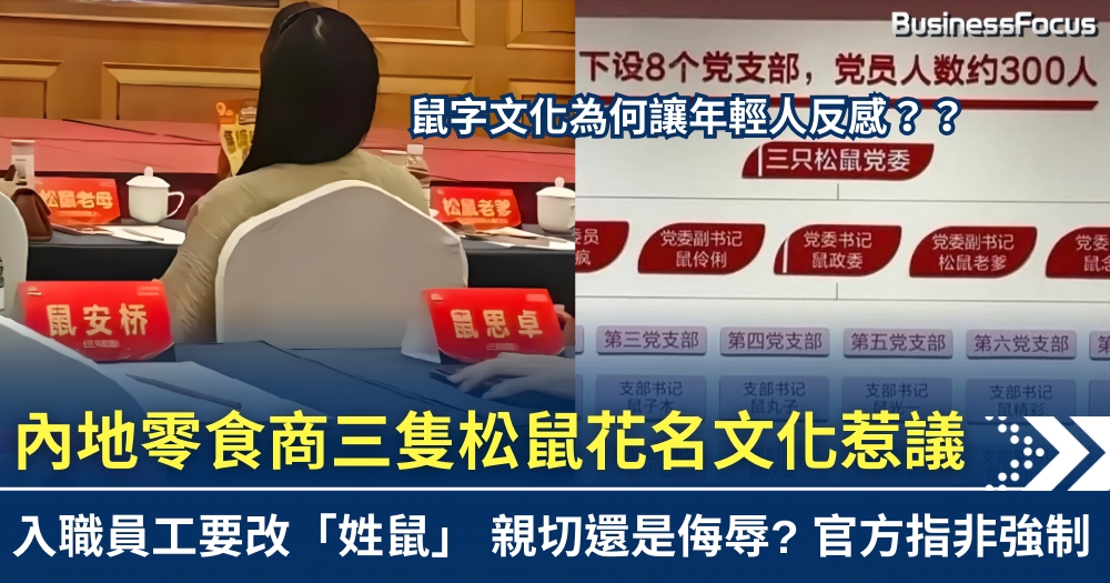 近日,內地零食名牌「三隻松鼠」被指要求員工入職後要改姓「鼠」,即是花名改成「鼠某某」的格式,這究竟是親切還是侮辱,引發網上熱議,甚至惹來部分顧客不滿及誤會。品牌發言人其後回應稱,此舉為企業文化,強調以「鼠」命名能營造親切感及突出品牌特色,但否認強制執行,稱員工若不配合亦不會有不良後果。事件引發兩極反應,部分網友覺得有趣,亦有人直言難以接受「鼠」字命名。