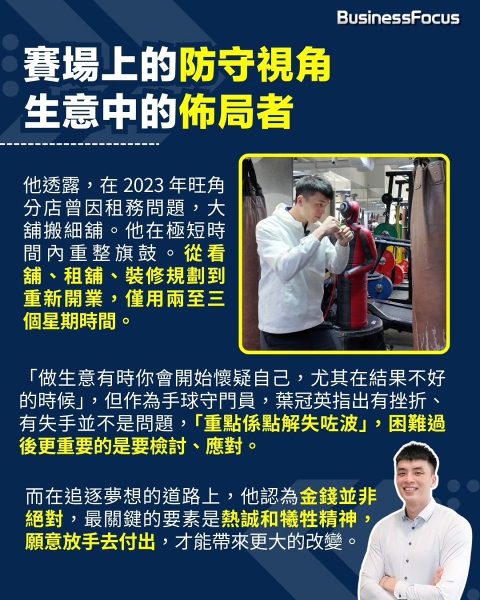 他透露,在 2023 年旺角分店曾因租務問題,大舖搬細舖。他在極短時間內重整旗鼓。從看舖、租舖、裝修規劃到重新開業,僅用兩至三個星期時間。「做生意有時你會開始懷疑自己,尤其在結果不好的時候」,但作為手球守門員,葉冠英指出有挫折、有失手並不是問題,「重點係點解失咗波」,困難過後更重要的是要檢討、應對。