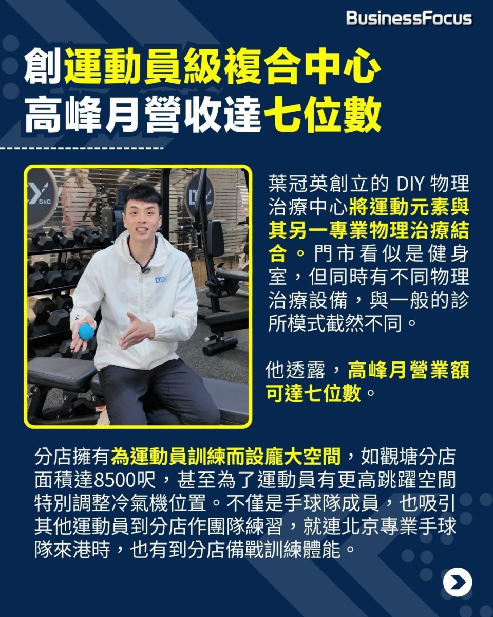 葉冠英創立的 DIY 物理治療中心將運動元素與其另一專業物理治療結合。門市看似是健身室,但同時有不同物理治療設備,與一般的診所模式截然不同。他透露,高峰月營業額可達七位數。