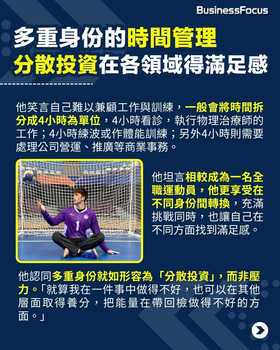 他坦言相較成為一名全職運動員,他更享受在不同身份間轉換,充滿挑戰同時,也讓自己在不同方面找到滿足感。他認同多重身份就如形容為「分散投資」,而非壓力。「就算我在一件事中做得不好,也可以在其他層面取得養分,把能量在帶回檢做得不好的方面。」