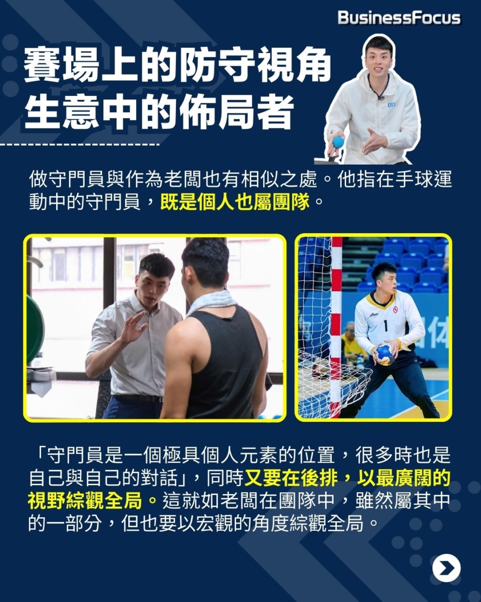 「守門員是一個極具個人元素的位置,很多時也是自己與自己的對話」,同時又要在後排,以最廣闊的視野綜觀全局。這就如老闆在團隊中,雖然屬其中的一部分,但也要以宏觀的角度綜觀全局。