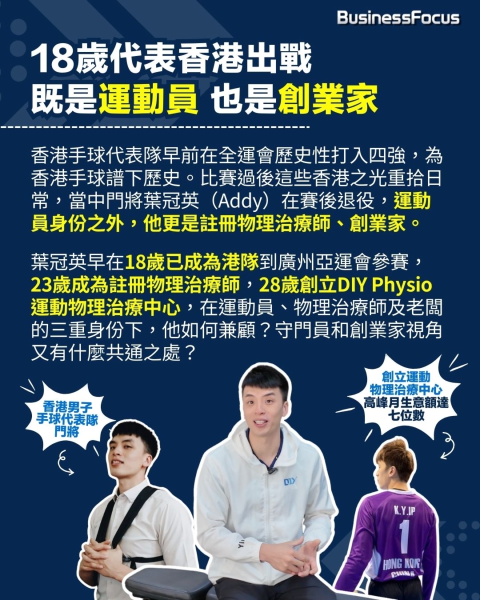 葉冠英早在18歲已成為港隊到廣州亞運會參賽,23歲成為註冊物理治療師,28歲創立DIY Physio 運動物理治療中心,在運動員、物理治療師及老闆的三重身份下,他如何兼顧?守門員和創業家視角又有什麼共通之處?