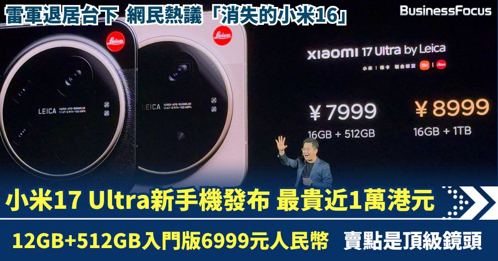 小米(1810)昨日(25日)舉行旗艦新品發布會,正式推出年度壓軸機型 Xiaomi 17 Ultra。新機最大賣點是頂級影像配置,採用1吋主鏡頭及2億像素「超級長焦鏡頭」組合,入門版12GB+512GB售價6,999元人民幣(約7,770港元)。此外,小米宣布與徠卡(Leica)合作升級,帶來特別版手機 Xiaomi 17 Ultra by Leica,主攻高端攝影愛好者市場,頂配版售價8,999元人民幣(約9,990港元),逼近一萬港元大關!新機於27日10時正式開售。