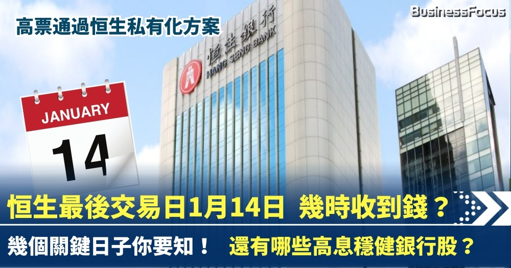 根據公告安排,恒生銀行股份於香港聯交所買賣之預期截止時間為 2026年1月14日(星期三)下午4時10分,在當日收市後,將由多個指數及分類指數中剔除。而私有化計劃預期在1月26日(星期一)完成,恒生銀行股份於香港聯交所的上市地位將於 2026年1月27日(星期二)下午4時正被撤銷。股東最快可以在2月4日(星期三)或之前,收到退款。