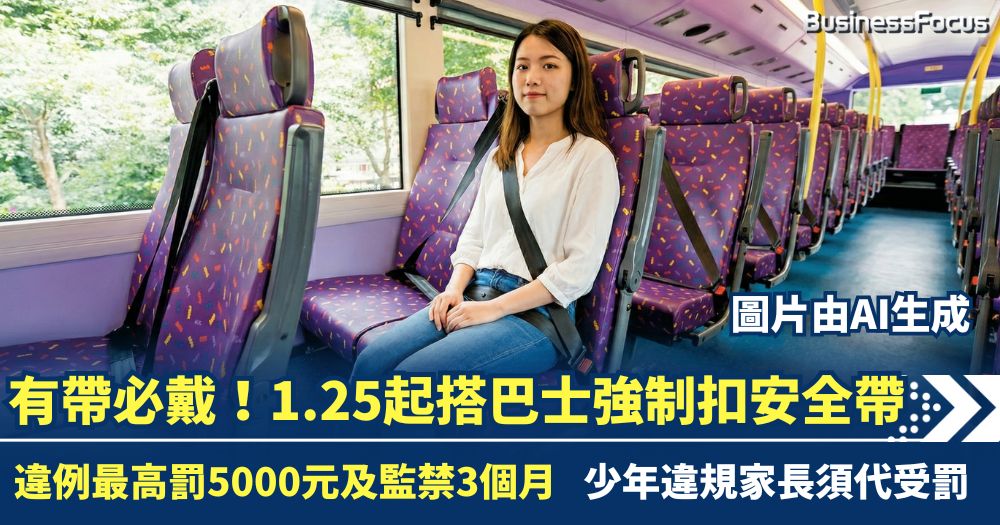 本月25日起,香港市民乘搭任何設有安全帶的車輛,包括巴士、校巴及旅遊巴等,均必須強制佩戴安全帶,違例者最高可被罰款5,000元及監禁3個月。運輸署強調執行「有帶必戴」原則,並重申「邊個坐落張櫈就要負法律責任」;若少年乘客違例,法庭更可判處家長代繳罰款。