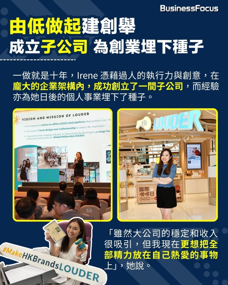 一做就是十年,Irene 憑藉過人的執行力與創意,在龐大的企業架構內成功創立了一間子公司,而經驗亦為她日後的個人事業埋下了種子。「雖然大公司的穩定和收入很吸引,但我更想把全部精力放在自己熱愛的事物上」,她說。