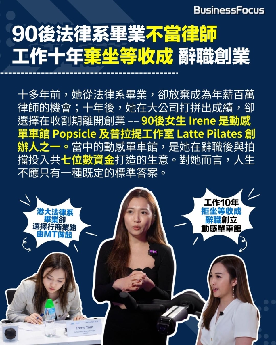 十多年前,她從法律系畢業,卻放棄成為年薪百萬律師的機會;十年後,她在大公司打拼出成績,卻選擇在收割期離開創業 –– 90後女生 Irene 是動感單車館 Popsicle 及普拉提工作室 Latte Pilates 創辦人之一。當中的動感單車館,是她在辭職後與拍擋投入共七位數資金打造的生意。對她而言,人生不應只有一種既定的標準答案。