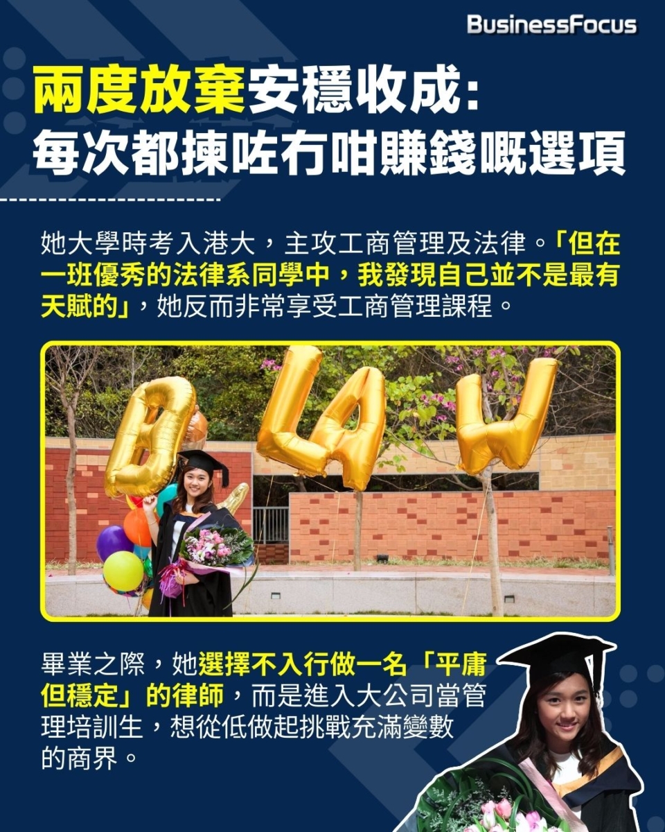 作為典型的高材生,她的求學之路走得順遂,考入港大,主攻工商管理及法律。「但在一班優秀的法律系同學中,我發現自己並不是最有天賦的那一個」,她察覺到自己的靈魂並不屬於法律條文與辯論之間,相反卻非常享受工商管理課程。