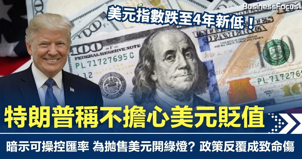 美元周二持續走弱,追蹤美元兌一籃子貨幣跌至四年新低。美國總統特朗普接受訪問時直言「不擔心美元貶值」,並稱「希望美元回歸應有水平」,更暗示自己可像操控「悠悠球」般影響匯率走勢。相關言論加劇市場憂慮總統是為繼續拋售美元「開綠燈」,投資者亦擔心其反覆政策,將導致資金撤離美國,故美元跌勢進一步擴大即繼續貶值。