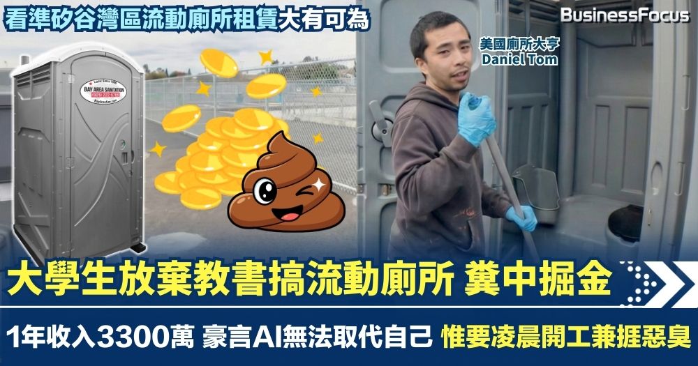 糞中也有黃金屋!AI科技巨頭雲集的美國三藩市灣區,打工仔及老闆紛紛將重點發展AI之際,31歲的Daniel Tom卻選擇了一條截然不同的創業之路。讀大學時曾想做體育老師的他,看準人類最基本的「解決」需求永無止盡,畢業後數年毅然創立一間「流動廁所」租賃公司,結果其生意短短兩、三年之間大爆發,《CNBC》指其2025年收入即高達430萬美元(約3354萬港元)。漸踏入百萬富翁領域的「廁所大亨」Daniel Tom揚言,這是一種「不怕AI、AI也無法取代」的生意。但代價是凌晨起床兼要每天忍受難捱的惡臭,還有對清潔衞生的絕對執著,這世上,又有多少大學生做得到?