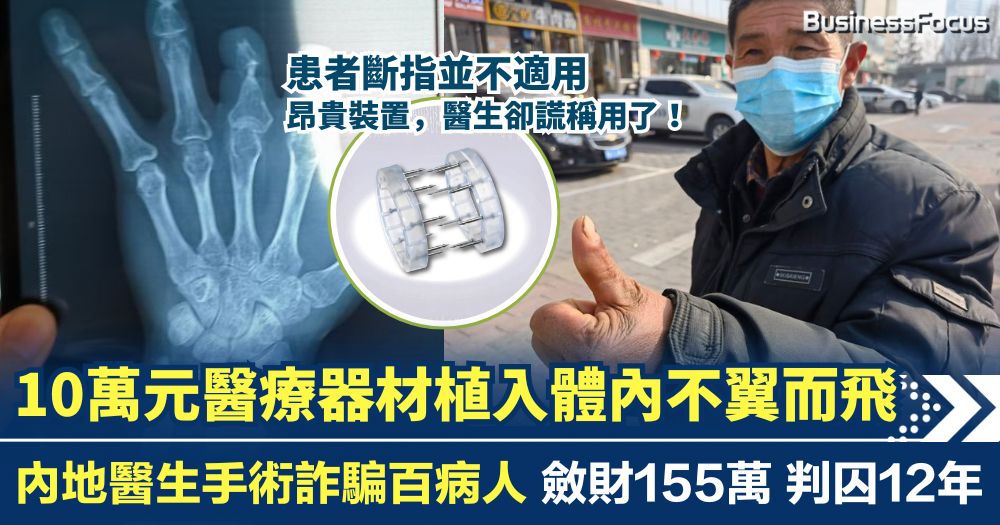 手術費用高昂,但植入體內的醫療器材憑空消失了?內地一名患者花費10萬多元進行斷指接駁手術,醫生聲稱植入的6個微血管吻合裝置,但事後檢查竟發現體內根本沒有該器材。這宗離奇的器材失蹤案,最終揭開了河南一名資深醫生長達4年的斂財騙局:他涉嫌詐騙94名病人,例如訛稱植入了昂貴器材但其實沒有,又或是在明知器材不適用的情況下仍然濫用,甚至將廢棄器材縫入體內充數。該醫生4年間非法斂財逾155萬元人民幣,涉及詐騙資金高達205萬元,最終被判囚12年。
