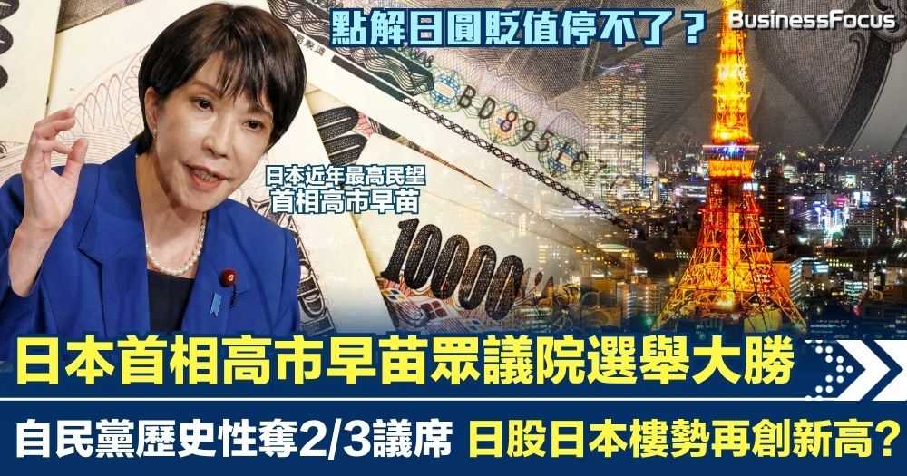 高市早苗日本眾議院選舉贏到開巷 自民黨歷史性奪2/3議席 日股日本樓勢升 日圓貶值停不了!
