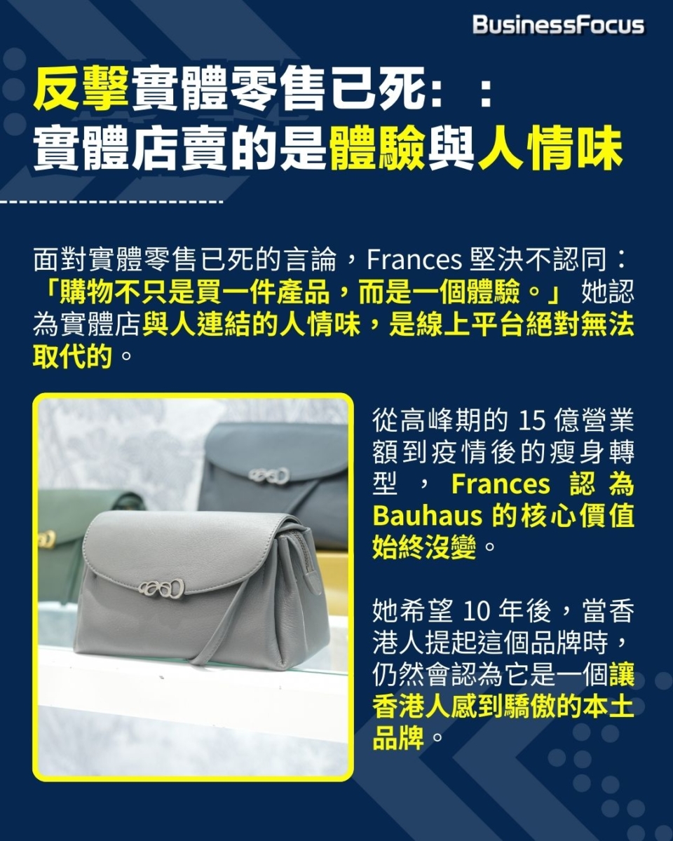 從高峰期的 15 億營業額到疫情後的瘦身轉型,Frances 認為 Bauhaus 的核心價值始終沒變。她希望 10 年後,當香港人提起這個品牌時,不僅是因為它產品質素好,更因為它是一個「讓香港人感到驕傲」的本土品牌。