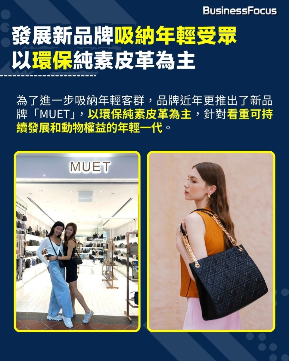 為了進一步吸納年輕客群,品牌近年更推出了新品牌「MUET」,以人造皮為主,針對年輕一代非常看重可持續發展和動物權益。