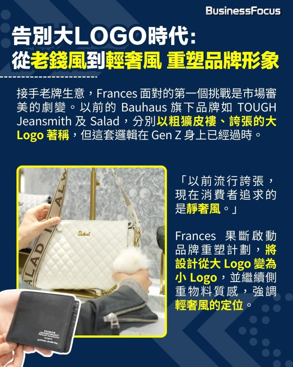 接手老牌生意,Frances 面對的第一個挑戰是市場審美的劇變。以前的 Bauhaus 旗下品牌如 TOUGH Jeansmith 及 Salad,分別以粗獷皮褸、誇張的大 Logo 著稱,但這套邏輯在 Gen Z 身上已經過時。
