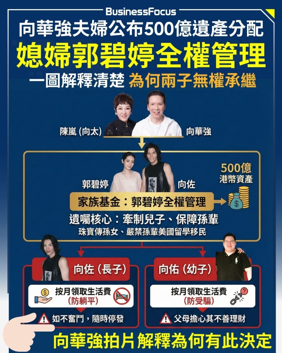 香港影視大亨向華強夫婦驚爆百億遺產分配方案,兩名親生兒子向佐、向佑竟「承繼不到天價財產」?!香港電影大亨向華強近日在社交媒體發布影片,透露他與夫婦陳嵐所有財產(市場估計或高達500億港元)將成立家族基金,並指定交由大兒媳郭碧婷全權管理。他狠批兩子不擅理財易受騙,為防止有人「敗家」,遂決定跳過兒子,直接傳承予孫輩。向氏兄弟日後只能按月領取生活費,他更明言,若兒子躺平不努力,連基本生活費亦會中斷。