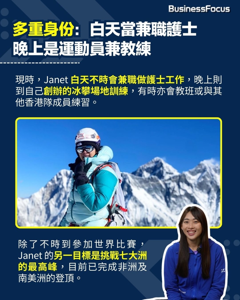 Janet 早在18歲已接觸冰雪攀登運動,當初參加童軍行雪山活動後獲邀請,成為香港冰雪攀登隊代表成員。至大學時期,Janet 修讀護理系,畢業後順利成為一名全職護士。8年間,她暫停了運動員身份,但內心的登山魂從未熄滅,「那時候想,我不想老了才後悔,我想趁年輕看看自己可以行得幾遠、去到幾高」。至疫情過後,她毅然辭去全職護士工作,重拾8年前的冰攀夢。