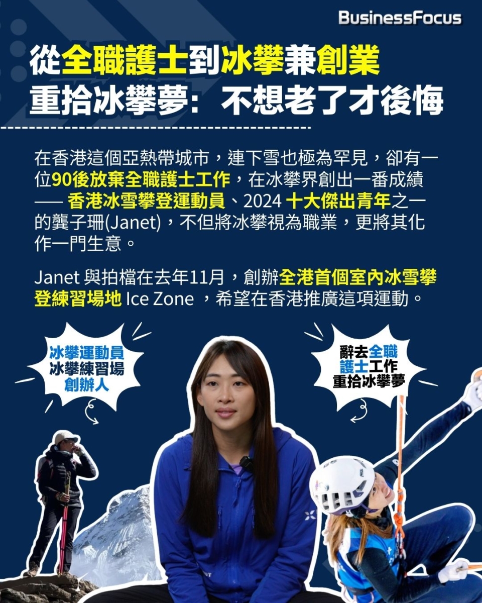 在香港這個亞熱帶城市,連下雪也極為罕見,卻有一位90後放棄全職護士工作,在冰攀界創出一番成績 —— 香港冰雪攀登運動員、2024 十大傑出青年之一的龔子珊(Janet),不但將冰攀視為職業,更將其化作一門生意。