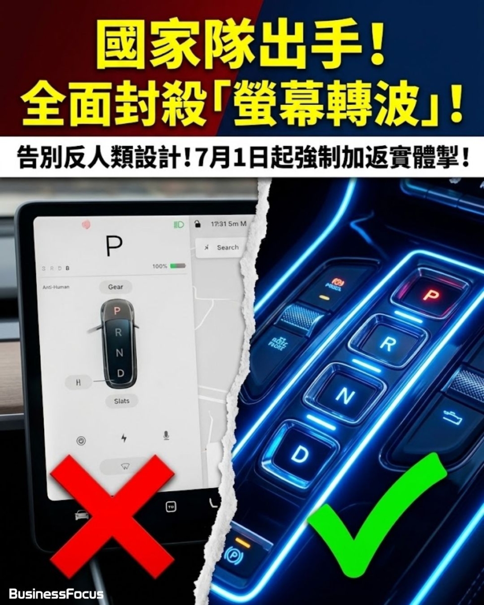 封殺螢幕換檔: 新規明確規定P、R、N、D檔位的切換必須透過實體件完成,嚴禁採用「純螢幕換檔」設計 。