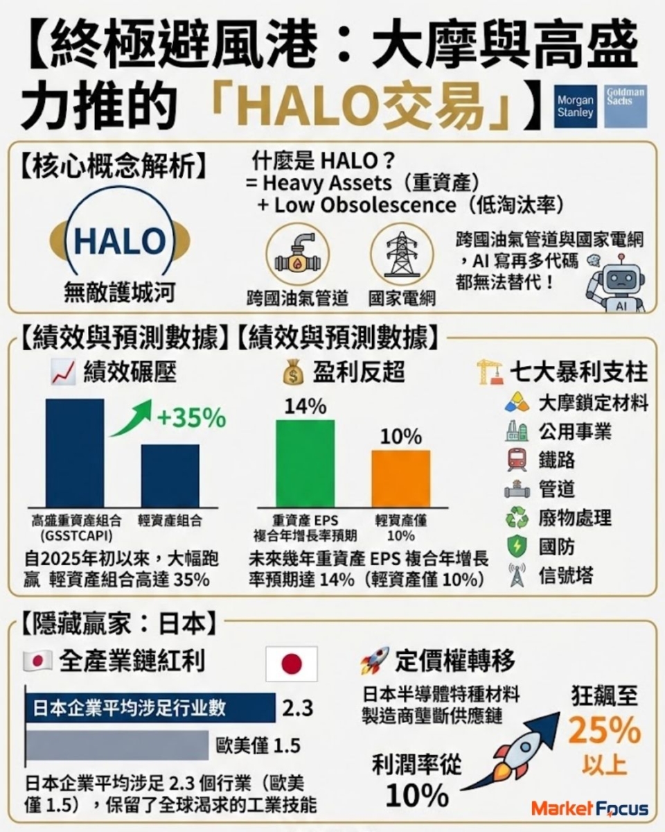 「HALO」是摩根士丹利與高盛等頂級投行共同推崇的新策略,全稱為「重資產、低淘汰」,Heavy Assets, Low Obsolescence 。