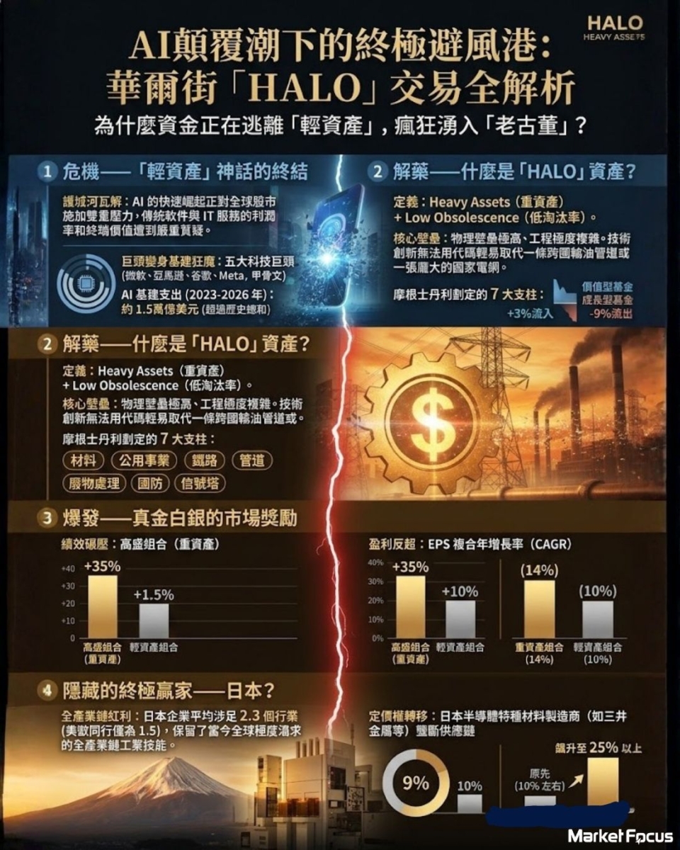 當AI人工智能的浪潮似乎要吞噬所有傳統商業模式,連傳統軟件巨頭的護城河都開始被市場質疑,華爾街的「聰明錢」卻正在上演一場史詩級的資金大轉移。過去十年備受追捧的「輕資產」神話正在破滅,取而代之的是一個讓無數老牌工業巨頭強勢回歸的新鮮概念「HALO交易」。而意外的終極贏家,竟可能會是日本?