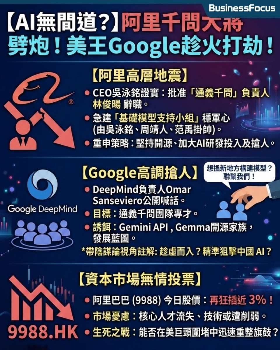 全球AI大戰的火藥味愈來愈濃,今次戰火更直接燒到中美科技巨頭的家門口!阿里巴巴(9988)旗下核心AI基礎模型「通義千問」(Qwen)突然爆發大地震,繼昨日負責人林俊暘宣告離巢,公司今日已正式批准林俊暘的辭職申請。更令人細思極恐的是,美國AI王者Google竟然趁火打劫,明目張膽地向阿里的AI團隊高調拋出橄欖枝企圖強行挖角 !市場對阿里在AI賽道上的前景憂心忡忡,直接拖累今日阿里股價繼續狂插近3%。究竟只是一場單純的科技界人才流動,還是針對中國AI崛起的一場精準狙擊戰?