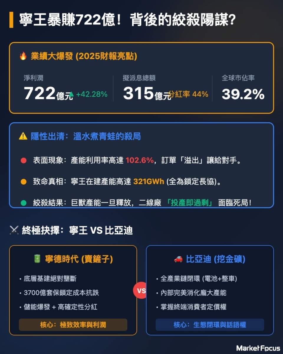 價格戰殺到血流成河,誰才是新能源界真正的吸金巨獸?「寧王」寧德時代(3750)交出了一份震驚市場的2025年成績單,不僅豪賺逾720億元,更拋出315億巨額分紅股息震撼彈 !受此「狂暴」業績刺激,寧德時代(3750)績後上漲,早盤一度衝擊10%漲幅,目前回落穩定漲幅逾8% 。但在華麗數據與股價狂歡的背後,卻隱藏著以辣招趕絕二三線競爭對手的企圖,站在投資的十字路口,散戶此刻究竟該追入「寧王」,還是選擇全產業鏈霸主比亞迪(1211)?