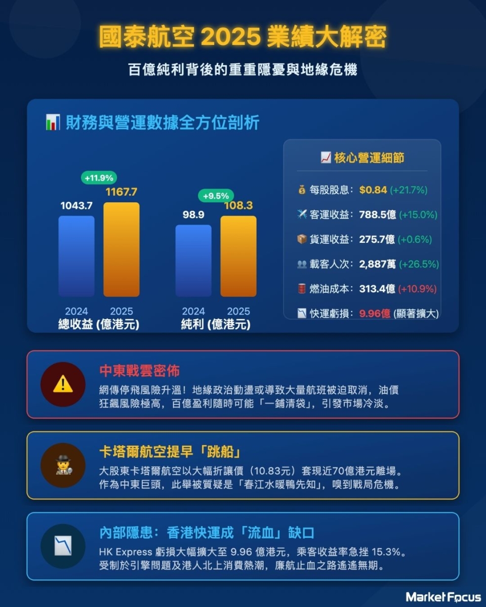 國泰航空的2025年財報,無疑是一份完美的「過去式」成績表 。但對於投資者而言,更重要的是「未來式」。大行及機構投資者對股價的冷靜反應 ,正正提醒散戶切勿被百億純利及高息輕易蒙蔽。在中東戰火的陰霾、主要股東的折讓離場 ,以及香港快運的持續虧損下 ,國泰未來的復甦之路,恐怕猶如在萬尺高空走鋼線般如履薄冰。