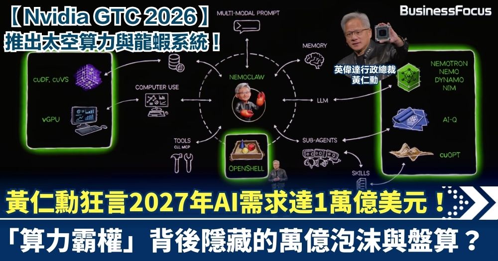 【Nvidia GTC 2026】黃仁勳推出太空算力與龍蝦系統!狂言2027年AI需求達1萬億美元!「算力霸權」背後隱藏的萬億泡沫與盤算?