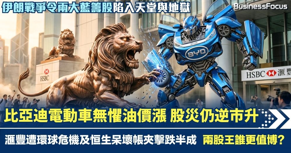 伊朗戰爭令兩大藍籌股陷入天堂與地獄 比亞迪電動車無懼股災逆市升 滙豐遭環球危機及恒生呆壞帳夾擊跌半成 兩大新舊股王誰更值博?