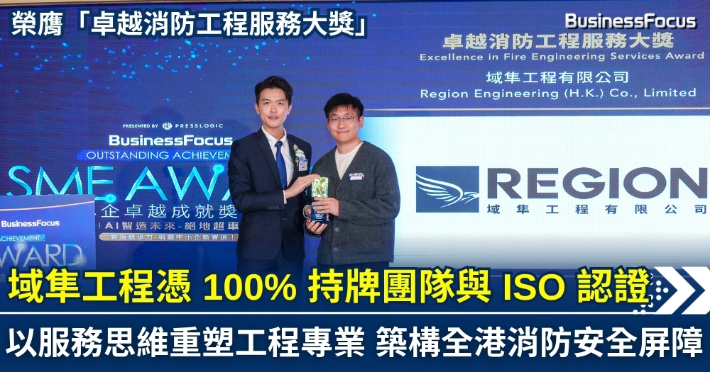 在建築林立的香港,消防安全是城市運作的根基,亦是各行各業安居樂業的重要保障。在剛圓滿結束的「BusinessFocus 中小企卓越成就獎 2026」頒獎禮中,域隼工程有限公司(Region Engineering (H.K.) Co., Limited)憑藉深厚的專業技術儲備與獨特的經營理念,獲頒「卓越消防工程服務大獎」,成為業界矚目的典範。