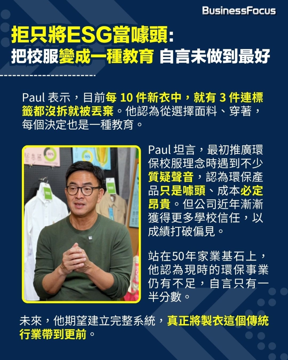 3年前,他從女兒的校服中找到靈感,將業務推至校服產品。「質地偏硬、易褪色、易爛,幾十年來,校服竟然沒變過」Paul 苦笑著說,「而售價卻一點也不便宜。」