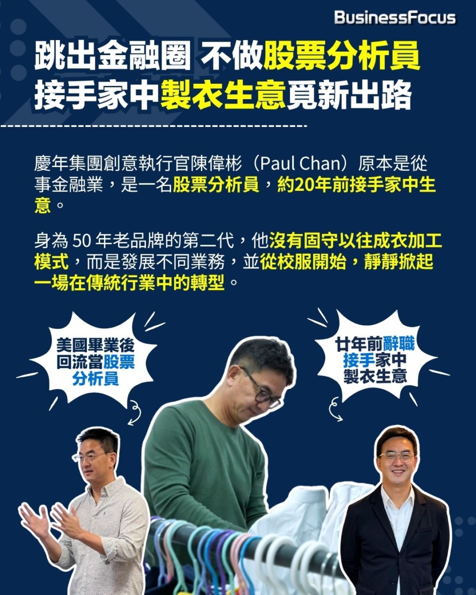 慶年集團創意執行官陳偉彬(Paul Chan)原本是從事金融業,是一名股票分析員,約20年前接手家中生意。身為 50 年老品牌的第二代,他沒有固守以往成衣加工模式,而是發展不同業務,並從校服開始,靜靜掀起一場在傳統行業中的轉型。