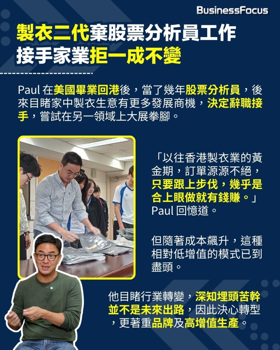 Paul 在美國畢業回港後,在金融圈當股票分析員,後來目睹家中製衣生意有更多發展商機,決定辭職接手,嘗試在另一領域上大展拳腳。