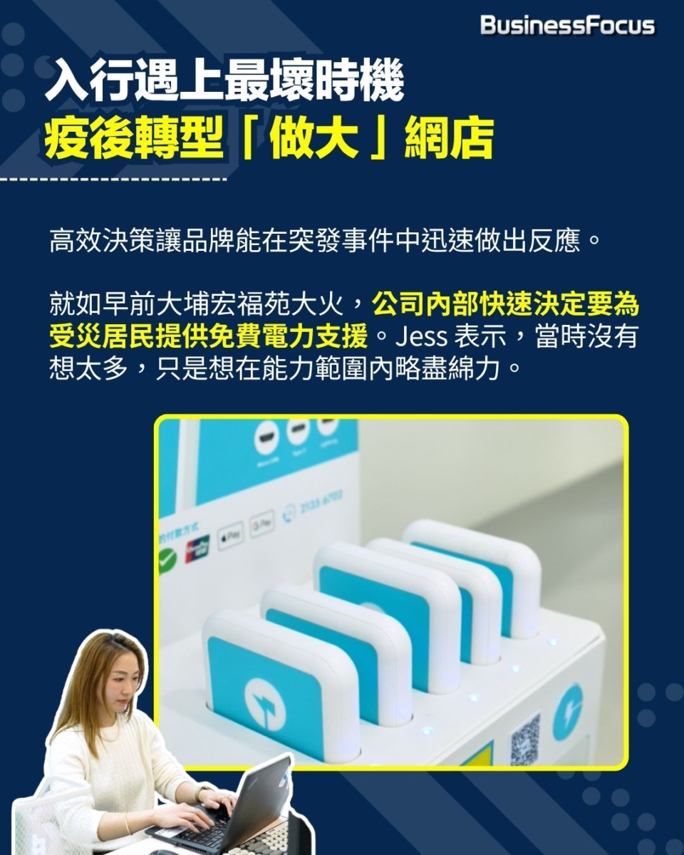 高效決策讓 CHARGESPOT 能在社會突發事件中迅速做出反應。就如早前大埔宏福苑大火,公司內部快速決定要為受災居民提供免費電力支援。Jess 表示,當時沒有想太多,只是想在能力範圍內略盡綿力。